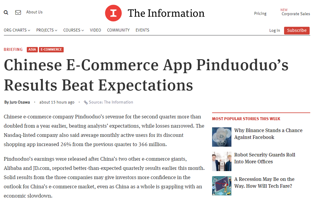 ?▲科技新聞媒體The?Information報道,拼多多2019?Q2財報全面超越市場預期。