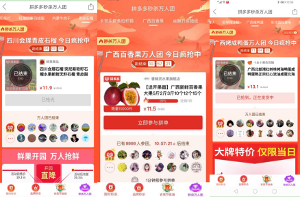 “9995,9999,搶光了!”8月25日13點,廣西百香果秒殺萬人團售罄。農貨節期間,廣西海鴨蛋、東北大米、寧夏枸杞、湖南零食大禮包、月餅、貴州紅心獼猴桃,四川會理石榴、廣西百香果等多個萬人團遭瘋搶。大涼山會理石榴,更是太陽沒出來1萬單即被秒光,大量消費者醒來想搶時即顯示“已結束”。