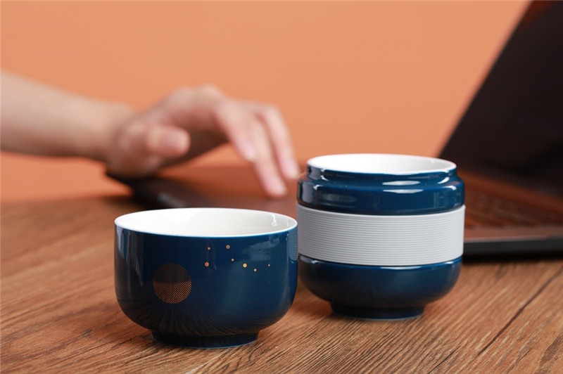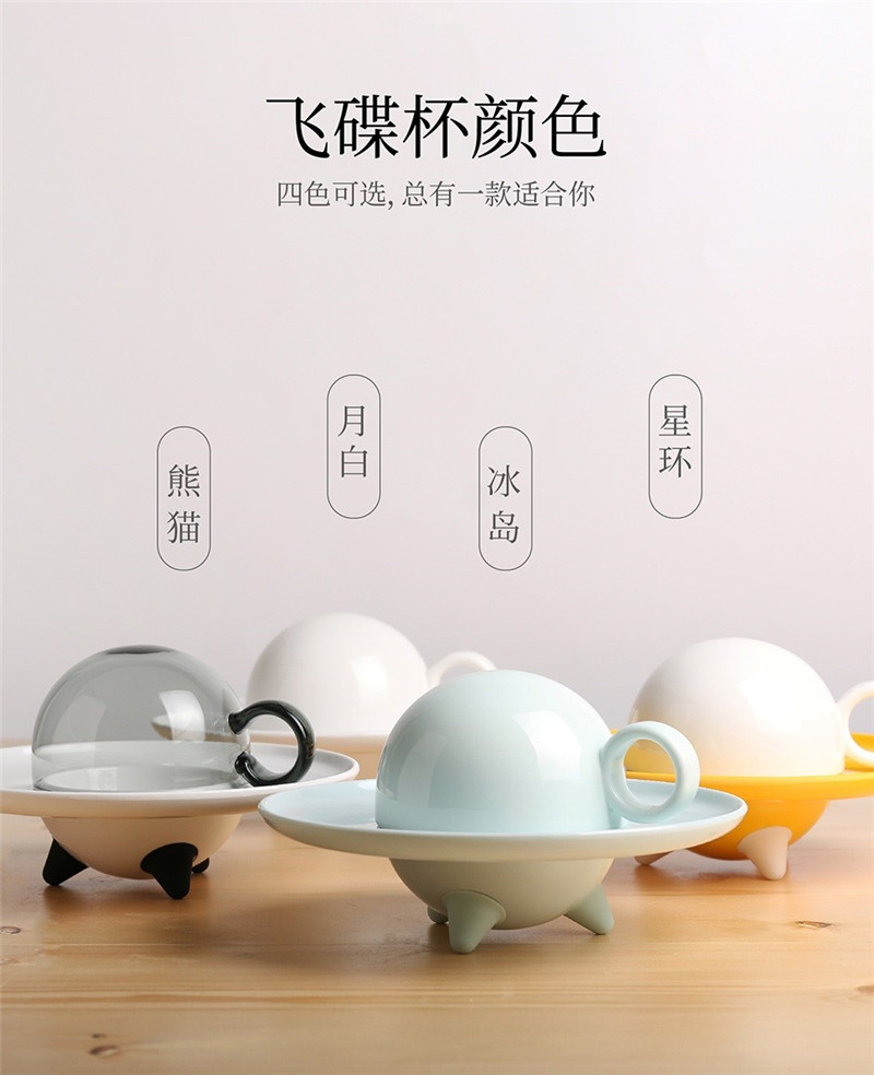 碟形的杯托可以當作點心托盤使用,硅膠腳墊做成飛碟腳架的形狀,讓托盤放置更穩當,碟上是一個白瓷(玻璃)小杯,閑置時可反扣,避免灰塵的進入。熊貓、星環、冰島、月白,四種顏色的杯子隨機分配,跟時下流行的盲盒一般,不打開就不知道手里的這個是否是你心儀的款式。