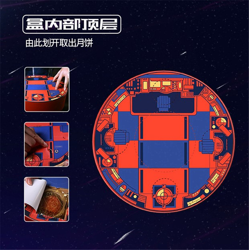 記憶機械化的風格設計,扁圓柱形的外觀配上飛船的圖案樣式,整個盒子如同一艘飛船一般。打開盒蓋,還能看到內部頂層上繪制的團隊工作臺艙位圖,如同進入到一架需多人協作的宇宙飛船內部一般。