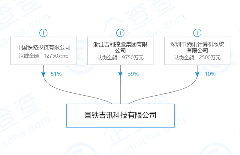 據企查查顯示,國鐵吉訊科技有限公司的股權構成中,中國鐵路投資有限公司占股51%,浙江吉利控股集團有限公司持股39%,深圳市騰訊計算機系統有限公司持股10%。