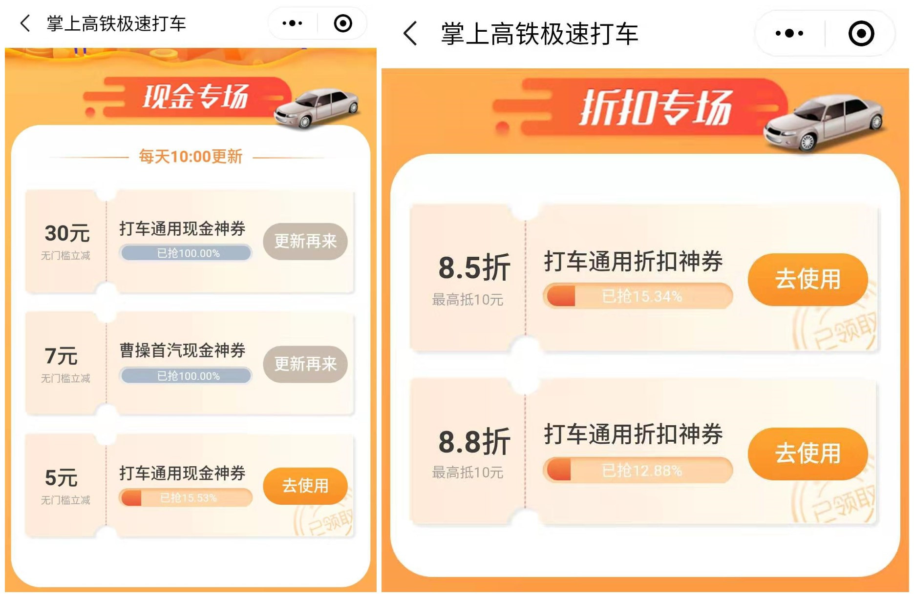 此外,十一期間,“極速打車”小程序還推出金秋返現活動,100%中現金,可領取三種現金券以及兩種折扣券。