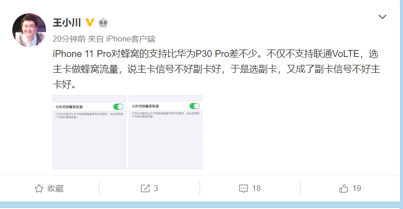 王小川稱,iPhone11 Pro對蜂窩的支持比華為P30 Pro差不少。不僅不支持聯通VoLTE,選主卡做蜂窩流量,說主卡信號不好副卡好,于是選副卡,又成了副卡信號不好主卡好。 ????