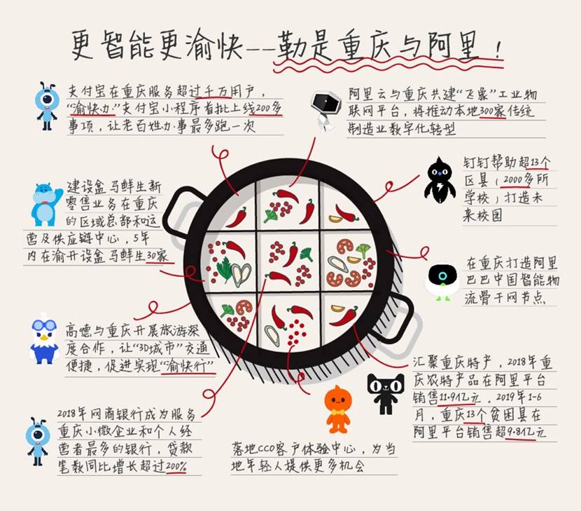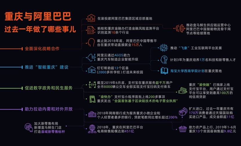 阿里巴巴一直積極參與重慶在大數據智能化領域的建設,雙方合作持續深入。截至2019年6月底,支付寶在重慶已經服務超千萬用戶,網商銀行已累計為數十萬重慶小微企業和創業者提供普惠金融支持。“渝快辦”支付寶小程序首批上線200多事項,重慶發出“全國首張基于區塊鏈技術的電子營業執照”。數字經濟也進一步促進重慶城鄉融合、區域協調發展。2019年1-6月,重慶13個貧困縣在阿里巴巴平臺銷售近10億元。截至2018年底,阿里巴巴中國零售平臺在重慶帶動直接就業15萬人。