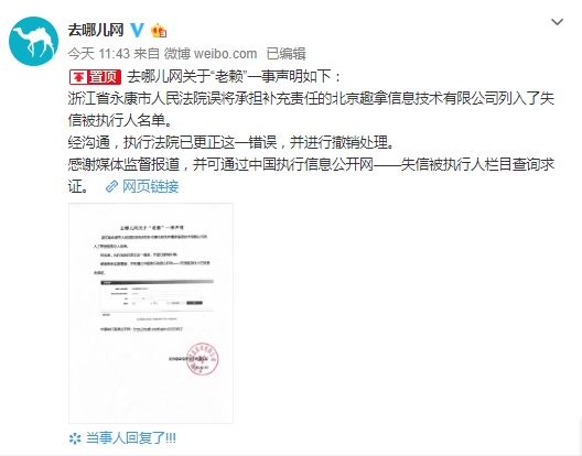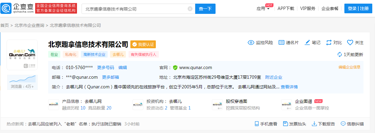 去哪兒網表示,感謝監督,可通過中國執行信息公開網——失信被執行人欄目查詢求證。
