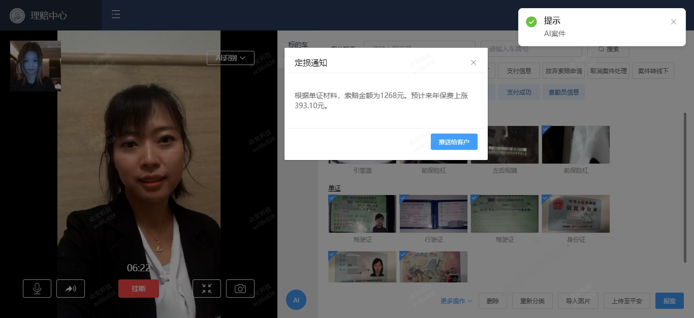 眾安科技副總經理蘇煒鑫在媒體溝通會上表示,“通過前臺科技視訊技術,配合丟幀補時和直播技術保證視頻流暢進行,車主只需手持終端設備,通過OCR可自動識別相關圖片信息,并將理賠單證照片分流并合理分類,免去繁瑣的客服單證錄入,通過AI定損,識別損失部位和程度,自動帶出賠付金額。”