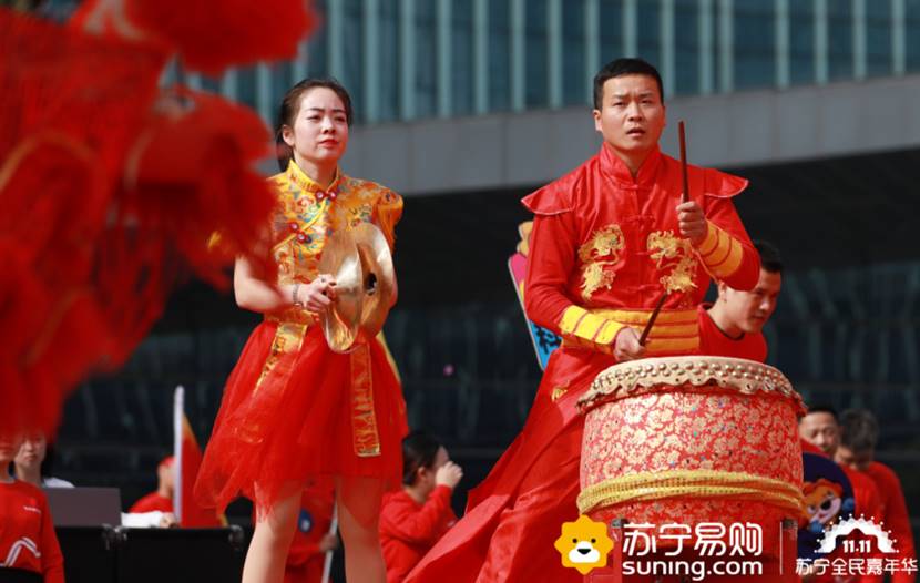 除了明星“到場”外,蘇寧員工也花式玩梗。既有野狼disco、手語唱歌、抖音熱舞等網友追捧的新潮玩法,也有舞獅、揮大旗、擂戰鼓等熱鬧場景。