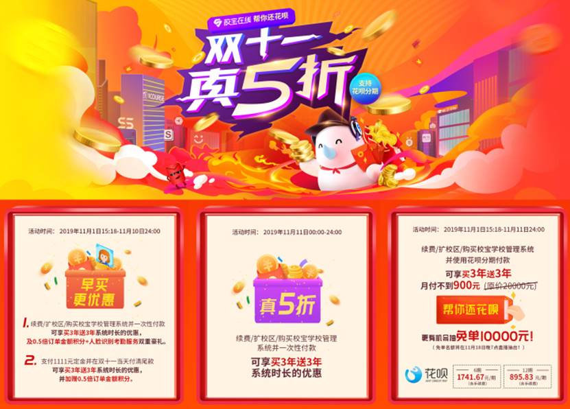 11月11日全天,機構購買校寶學校管理系統3年時長,即刻再享3年免費時長。此外,校寶攜手花唄為機構提供多種分期付費選擇,月供最低不到900元,大大降低了機構的“信息化”門檻;而在所有分期用戶中,還將誕生一個免單幸運機構,由校寶“幫你還花唄”,免單金額最高10000元,全力沖刺雙11。