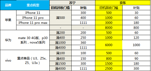 其中,在對比了國內各大電商平臺的以舊換新補貼力度以及服務體驗后,綜合看來,蘇寧易購的服務體驗最好,補貼力度也最大。目前雙十一期間,針對爆款4G手機,蘇寧易購的以舊換新補貼力度非常驚人。包括iPhone11系列新品、華為Mate30、P30以及vivo、OPPO、榮耀等眾多手機,蘇寧易購的以舊換新補貼相比于其它平臺,補貼力度大得多,甚至在10倍以上。