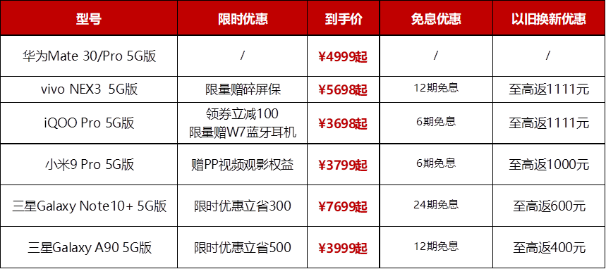 其中包括vivoNEX3 5G版、iQOO Pro 5G版、小米9Pro5G版、三星Note 10+ 5G版等各大品牌最新5G產品,蘇寧易購雙十一拿出6至24期免息分期、最高1111元的以舊換新補貼,同時還有限時立省300-500元的立減優惠。
