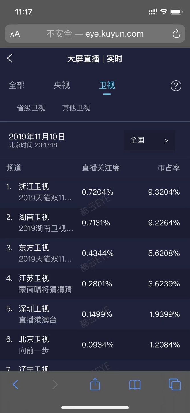 速途網11月11日消息(報道:李楠)今日,據第三方收視率監測公司酷云的實時數據,2019天貓雙11狂歡夜在浙江衛視、東方衛視兩大平臺的直播市占率達到近15%,強勢領跑全國同時段節目,其中浙江衛視以9.3204%穩居榜首。