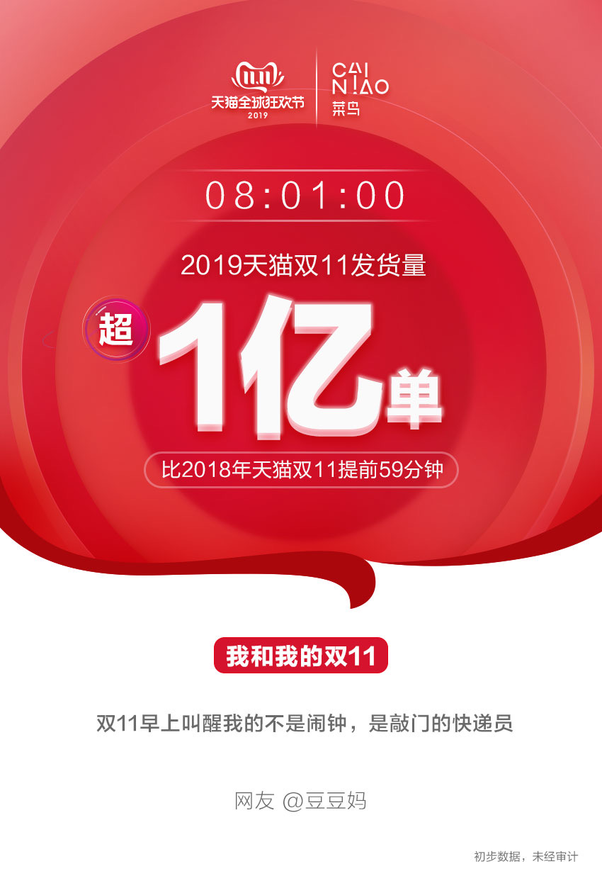 速途網(wǎng)11月11日消息(報(bào)道:李楠)今日上午8:01,天貓雙11第一億個(gè)包裹發(fā)出,僅用8小時(shí),刷新紀(jì)錄。從2013年以來,同樣數(shù)量的訂單發(fā)貨時(shí)長(zhǎng)已經(jīng)累計(jì)縮短40個(gè)小時(shí)。