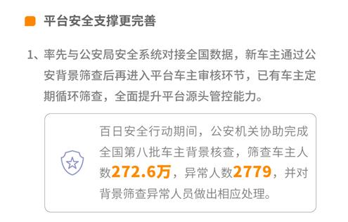 「百日安全行動」期間,公安機關協助嘀嗒出行完成全國第八批車主背景核查,篩查車主人數272.6萬,異常人數2779,背景篩查異常人員已由平臺及時做出相應處理。