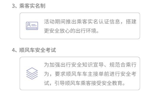 在安全宣導方面,嘀嗒出行從安全中心的“安全專欄”、“深夜出行安全手冊”、“國慶出行指南”、嘀嗒黑板報中發布的順風車行業最新信息,以及強制順風車車主接單前進行安全考試、在乘客端新增“順風車安全小課堂”,來進行全方位、多渠道的安全知識科普與引導,更廣泛地提高用戶安全意識,樹立科學的順風車安全觀。