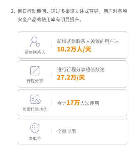正是通過不斷地優化產品安全功能與加強安全知識宣導,用戶的安全意識有明顯提高,這直觀體現在產品安全功能的使用率上:「百日安全行動」期間,新增緊急聯系人設置的用戶平均可達10.2萬/天,進行行程分享短信數達27.2萬/天,黑名單功能合計17萬人次使用,順風車虛擬號全量應用。