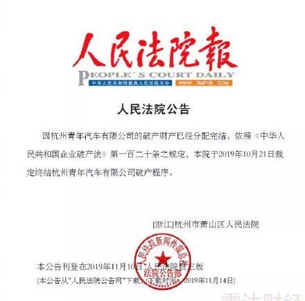速途網(wǎng)11月18日消息(報道:喬志斌)近日,人民法院公告,因青年汽車的破產(chǎn)財產(chǎn)已經(jīng)分配完結(jié),依照《中華人民共和國企業(yè)破產(chǎn)法》第一百二十條之規(guī)定,已于2019年10月21日裁定終結(jié)青年汽車破產(chǎn)程序。
