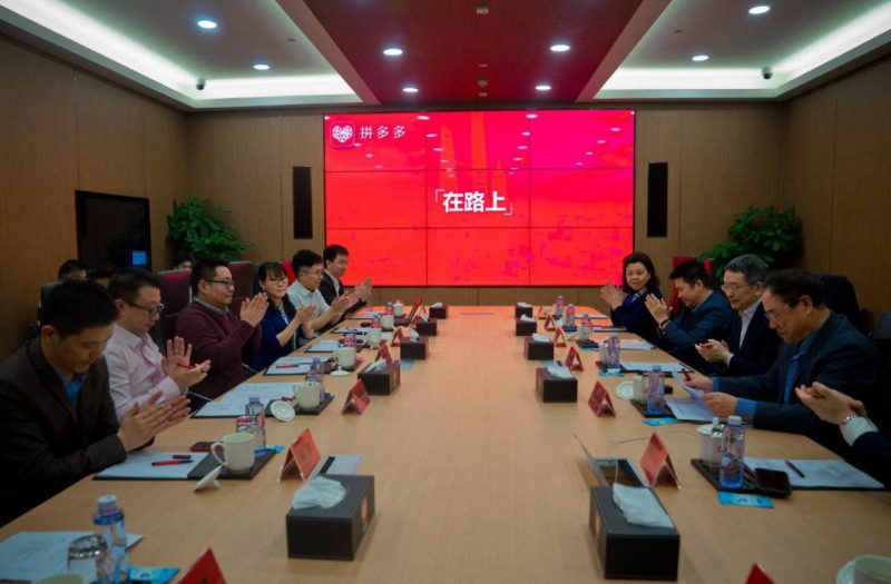 ▲中宣部版權(quán)管理局局長(zhǎng)于慈珂,中國(guó)出版協(xié)會(huì)常務(wù)副理事長(zhǎng)兼秘書(shū)長(zhǎng)劉建國(guó),上海市委宣傳部副部長(zhǎng)、上海市新聞出版局(上海市版權(quán)局)局長(zhǎng)徐炯,上海市出版協(xié)會(huì)秘書(shū)長(zhǎng)馬加一行正在聽(tīng)取拼多多方面關(guān)于平臺(tái)版權(quán)保護(hù)情況的匯報(bào)。(吳坤 攝)