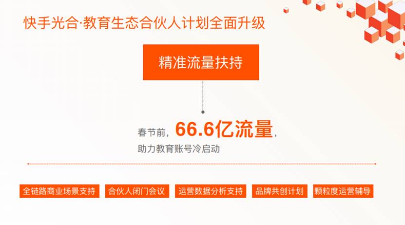 此次大會,快手教育生態還宣布了“生態合伙人計劃”的升級版,將在春節前就拿出66.6億流量助推,并提供全鏈路商業場景支持、合伙人閉門會議、運營數據分析支持、品牌共創計劃、顆粒度運營輔導等多項支持。