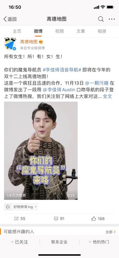 上個月,一條模仿李佳琦語氣的導航語音文本在網上引發熱議,很快登上了社交媒體熱搜榜。這原本只是網友的調侃段子,沒想到高德地圖快速響應,順勢跟進。11月16日,李佳琦在一段視頻中透露,高德地圖已經跟自己接洽了,“為我事業操心的粉絲我真的好感謝你們,你們幫我懟上熱搜之后,高德地圖就立馬來了,然后我們現在在聊當中,希望可以讓女司機們亢奮起來,開車專心起來,不要打瞌睡。”