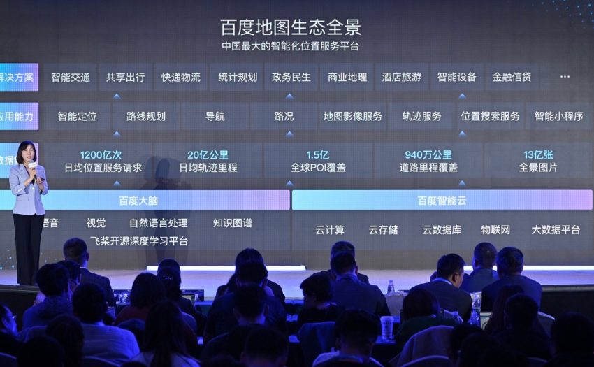 隨后,百度地圖事業(yè)部總經(jīng)理李瑩全面介紹了AI地圖的成績,并首次公布了新一代人工智能地圖生態(tài)全景。她介紹道:“基于百度大腦、百度智能云等百度硬核AI技術(shù)和地圖十余年的產(chǎn)品數(shù)據(jù)實力,我們打造了中國最大的智能化位置服務(wù)平臺,面向全球開發(fā)者輸出智能定位、路線規(guī)劃、導(dǎo)航、路況、地圖影像服務(wù)、軌跡服務(wù)、位置搜索服務(wù)、智能小程序八大應(yīng)用能力,全面賦能生態(tài)合作伙伴。從支持每一位開發(fā)者的服務(wù)需求,到支撐國家宏觀經(jīng)濟決策,百度地圖為各行各業(yè)提供定制化解決方案,攜手致力于讓城市管理更智慧、讓交通更順暢、讓出行更安全、讓生活更簡單。”
