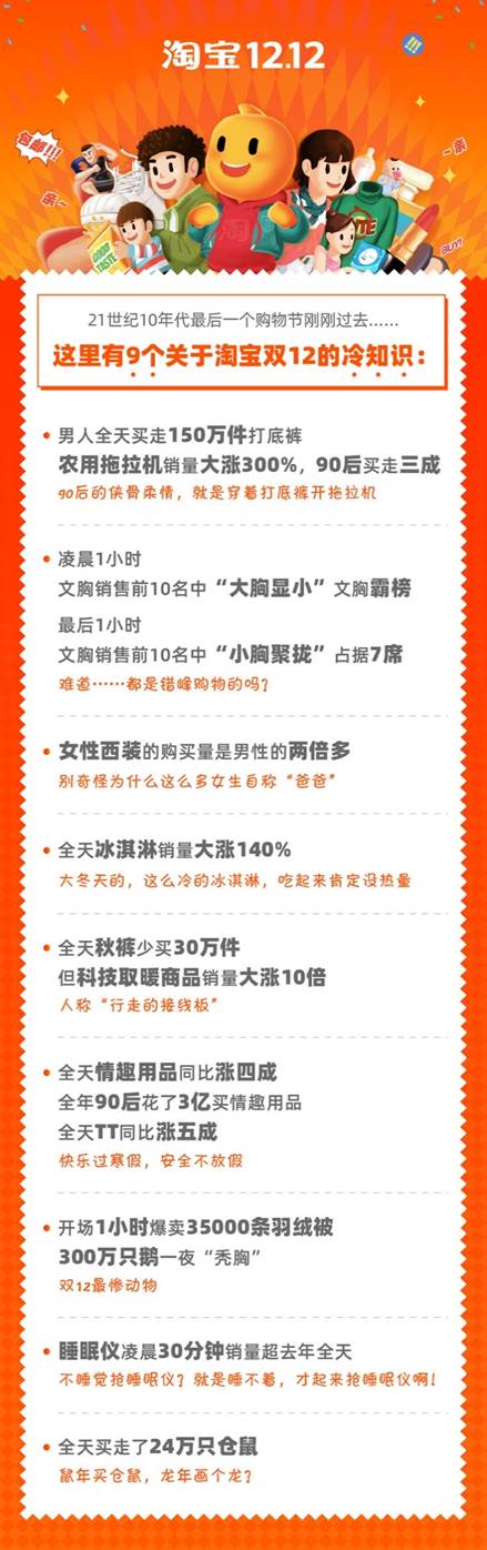 一個淘寶雙12帶火多少“神奇寶貝”?從90后突然去買拖拉機,到男人開始明白打底褲的好,還有過冬不買秋褲改用科技取暖的“電暖人”,以及引發上萬人只看不買的“帶絨打坐披風”……