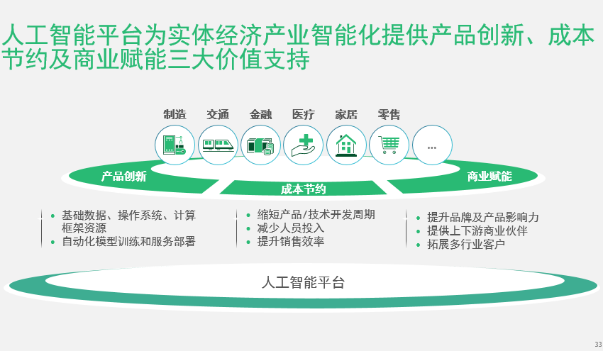 人工智能平臺能夠為實體經濟產業智能化提供產品創新、成本節約及商業賦能三大價值支持。無論是無人駕駛領域還是語音交互領域,開放平臺的出現確實都有效推動了行業發展。