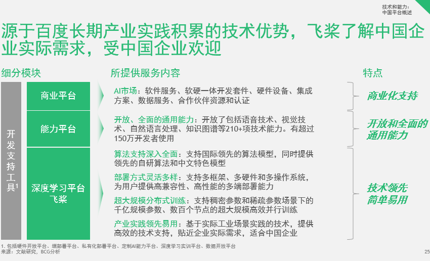 波士頓咨詢報告調研顯示,作為百度人工智能技術多年積累和產業實踐的集大成者,百度大腦已經實現了AI能力與應用場景的融合創新,升級為“軟硬一體的AI大生產平臺”,全面支持產業智能化升級。目前,百度大腦開放228項核心AI能力,日調用量突破萬億。作為百度大腦的核心組成部分,百度飛槳深度學習平臺也在持續升級。