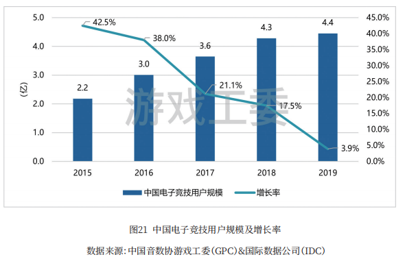 隨著電子競技行業(yè)的迅速發(fā)展,中國電子競技用戶也逐漸增多,從2015年的2.2億人增加至2019年的4.4億人,增長2.2億人,但同比增速也由2015年的42.5%下降至2019年的3.9%。