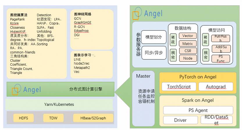 在3.0版本中,Angel重點(diǎn)研發(fā)了圖機(jī)器學(xué)習(xí)功能,包括圖表示和圖神經(jīng)網(wǎng)絡(luò)學(xué)習(xí)模型,同時(shí)提供預(yù)處理、圖挖掘等端到端數(shù)據(jù)處理能力,具有豐富的算法庫,提供了同構(gòu)圖、異構(gòu)圖多種圖計(jì)算范式和不同種類的圖算法。經(jīng)過騰訊內(nèi)部業(yè)務(wù)的大規(guī)模實(shí)踐,Angel在圖算法性能上同樣表現(xiàn)出眾,例如十億節(jié)點(diǎn)、千億邊規(guī)模的圖結(jié)構(gòu),運(yùn)行算法時(shí)能以SparkGraphX三分之一的計(jì)算資源,達(dá)到十倍處理性能。