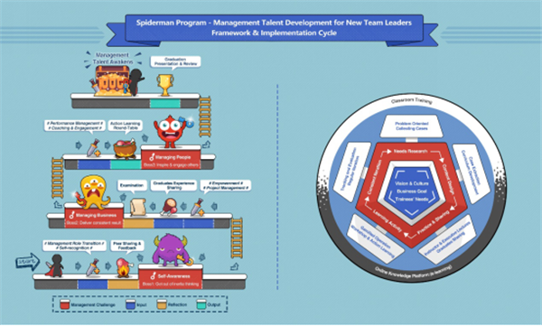 網易游戲學院獲得“2019ATD卓越實踐獎”的另一個培訓項目—“Spiderman新經理覺醒計劃”誕生于2014年,該計劃從“做真正適合網易游戲的新管理人員培訓項目”為出發點,用TaaS的培訓理念結合公司戰略,針對“知己、理事、管人”三大管理挑戰,用敏捷思維設計出游戲化、案例化、場景化學習內容,配合一系列如科舉考試、視頻展播等匠心獨具的學習活動和圓桌研討、咨詢輔導等持續的行為促進,加速新晉基層管理者的非線性發展。