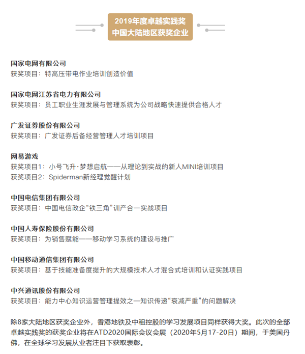 國際人才發展協會(ATD)是世界上最大的專注于人才發展領域專業人士的協會,ATD系列獎項作為全球人才發展企業培訓領域的最高殊榮,被譽為“全球培訓業界奧斯卡獎”。其中,“ATD卓越實踐獎”旨在表彰職場學習和人才培養方面的模范實踐,對于在實現組織目標方面取得清晰可量化的結果、滿足既定需求、有一定設計價值,能有效地與其他績效改善措施相結合,并能長期為組織帶來可持續工作成果的獲獎者予以肯定和鼓勵。