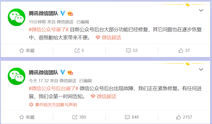 騰訊微信團隊:公眾號后臺大部分功能已經(jīng)修復 仙雯 ? 2019年12月26日 18:54 ? 快訊 速途網(wǎng)訊 剛剛,騰訊微信團隊在官方微博發(fā)文稱,目前公眾號后臺大部分功能已經(jīng)修復,其它問題也在逐漸恢復中。今日17點10分左右,微信公眾號系統(tǒng)出現(xiàn)大范圍癱瘓。 贊 (0) 仙雯 0 生成海報 京東健康聯(lián)合胡大一成立“京東健康心臟中心” 上一篇 2019年12月26日 18:50 OPPO Reno3 系列正式發(fā)布,主打雙模5G與視頻超級雙防抖,售價3399元起 下一篇 2019年12月26日 19:09