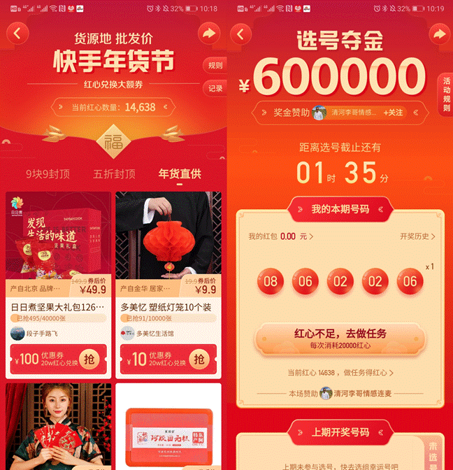 速途網1月2日消息(報道:李楠)昨日,快手開啟“點贊中國年”預熱場活動,并陸續上線多種趣味紅包玩法,用戶可以主要通過“兌換紅心”的方式,參與到“搶年貨”、“選號奪金”、“年度視頻”、 “集卡分一億”、“拆紅包”等一系列活動中。