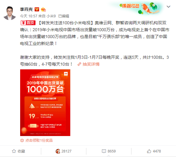 速途網訊 小米電視總經理李肖爽表示,2020年,小米電視目標是要在印度市場遙遙領先地拿下第一名,長期目標是拿下全球市場第一。稍早一點,李肖爽發布微博稱,奧維云網、群智咨詢兩大調研機構雙雙確認:2019年小米電視中國市場出貨量破1000萬臺,成為電視史上首個在中國市場年出貨量破1000萬臺的品牌。