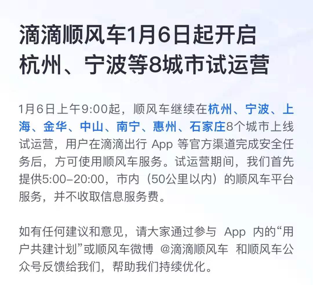 速途網訊 今日,據滴滴方出行App顯示,1月6日上午9:00起,順風車繼續在杭州、寧波、上海、金華、中山、南寧、惠州、石家莊8個城市上線試運營,用戶在滴滴出行App等官方渠道完成安全任務后,方可使用順風車服務。試運營期間,滴滴順風車首先提供5:00-20:00,市內(50公里以內)的順風車平臺服務,并不收取信息服務費。