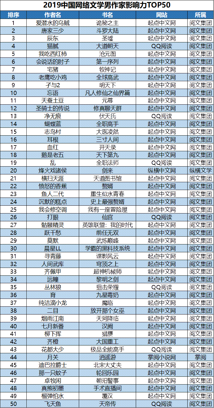 2019中國(guó)網(wǎng)絡(luò)文學(xué)男作家影響力TOP50