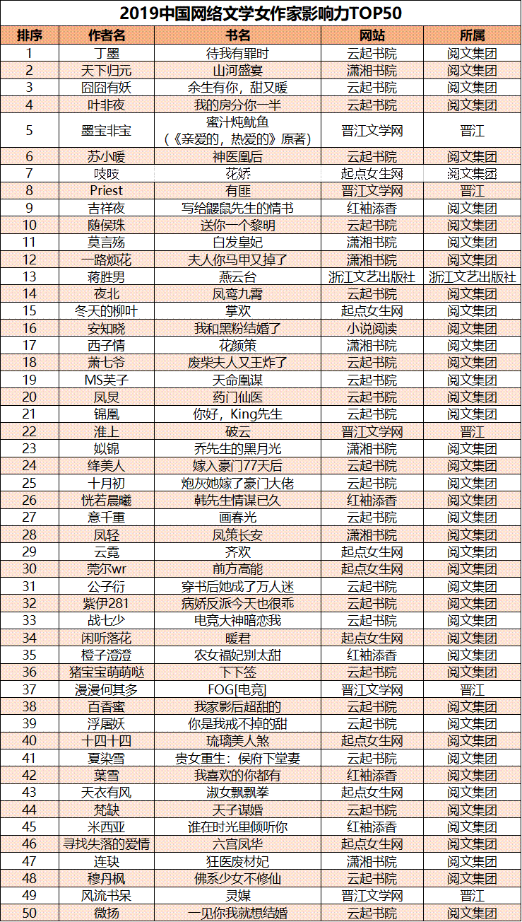 2019中國(guó)網(wǎng)絡(luò)文學(xué)女作家影響力TOP50