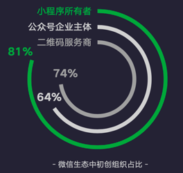 2019年,微信帶動就業數量達2601萬個,消費方式的變化也催生了大量新業態和新職業。小程序、公眾平臺、微信支付等工具,可幫助企業輕資產運行,更及時了解用戶需求,搭建貼近用戶的服務體系,降低商業資本準入門檻。報告數據顯示,小程序所有者、公眾號企業主體、二維碼服務商的初創組織占比分別為81%、64%及74%,64%的受訪企業認為公眾平臺提升了品牌與產品的知名度。