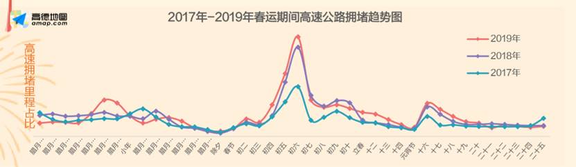 《報告》顯示,根據2017年-2019年春運期間數據,這三年春運期間全國高速整體擁堵趨勢較為一致,擁堵程度逐年增加,預計2020年春運期間擁堵將會更加集中。由于正月初七正式上班,大量人員集中在初五、初六返回工作地,預計今年整個春運期間,全國高速出行高峰將出現在1月30日,也就是正月初六。