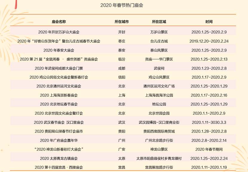 為了迎接全國各地的游客,全國部分景區也將在春節前后舉辦隆重的廟會,營造喜慶佳節氛圍,例如開封的萬歲山大廟會、棗莊的臺兒莊古城春節大廟會、泰安的泰安大廟會等熱門廟會都將陸續開辦,迎接天下賓客。