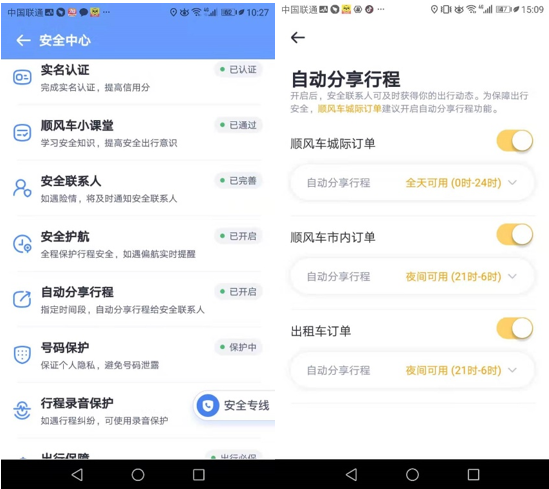 為了讓自己的跨城長途出行多一份保障,讓家人更加放心,在默認開啟安全護航功能的情況下,嘀嗒出行還提醒用戶,及時完善安全中心的各項設置,包括完善實名認證,參加順風車小課堂,設定安全聯系人和自動分享行程,開啟行程錄音保護等。
