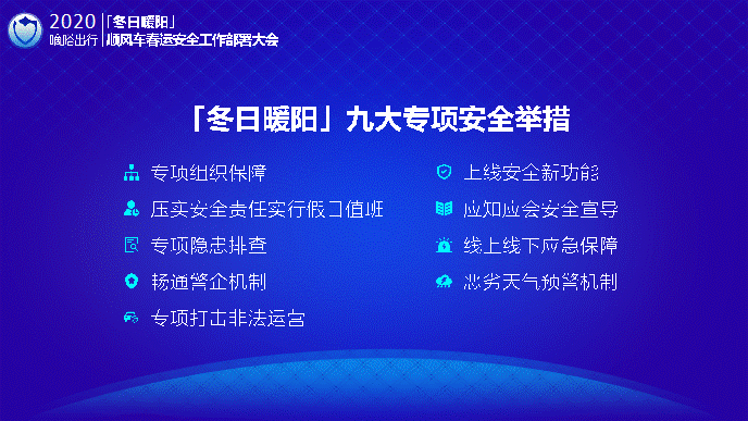 春運出行,安全第一,嘀嗒出行于2019年12月24日正式啟動「冬日暖陽」順風車春運安全專項行動計劃,聯合中國交通頻道在10省交管的聯合指導下,部署九大安全舉措,包括上線安全新功能,打擊非法營運,加強用戶安全宣導等,公司上下嚴陣以待,全方位守護用戶的安全,安心地返鄉和返程。