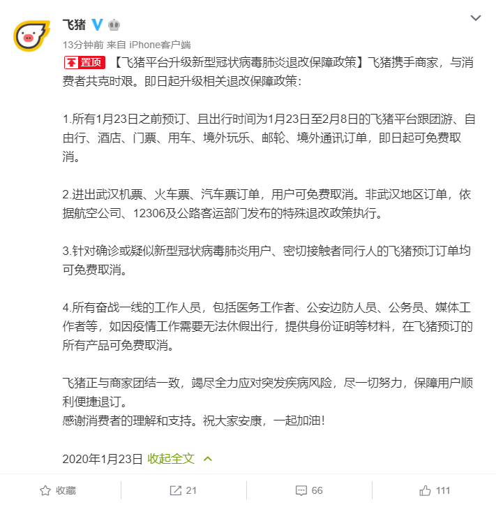 速途網訊 今日晚間,飛豬升級新型冠狀病毒肺炎退改保障政策。政策指出,所有1月23日之前預訂、且出行時間為1月23日至2月8日的飛豬平臺跟團游、自由行、酒店、門票、用車、境外玩樂、郵輪、境外通訊訂單,即日起可免費取消。