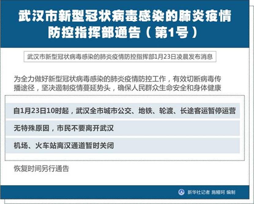 為了防止疫情進一步擴大,1月23日凌晨,武漢市發布公告:“自2020年1月23日10時起,全市城市公交、地鐵、輪渡、長途客運暫停運營;無特殊原因,市民不要離開武漢,機場、火車站離漢通道暫時關閉。”