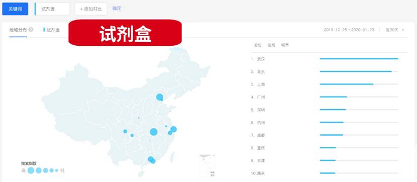 搜索大數據證明了這一現象。百度指數顯示,武漢市民除了對n95口罩極其關注外,對“試劑盒”也極為在意。從試劑盒的搜索指數趨勢圖可以看出,搜索指數在1月23日達到一個高峰,并且有進一步加大的趨勢。媒體報道稱,不少患者都對試劑盒的供應問題表示擔憂。