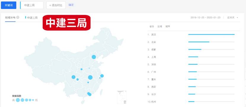 在這兩個搜索詞的地域分布中,武漢均位列第一。尤其中建三局,武漢搜索該詞的量級幾乎達到第二名北京市的兩倍。