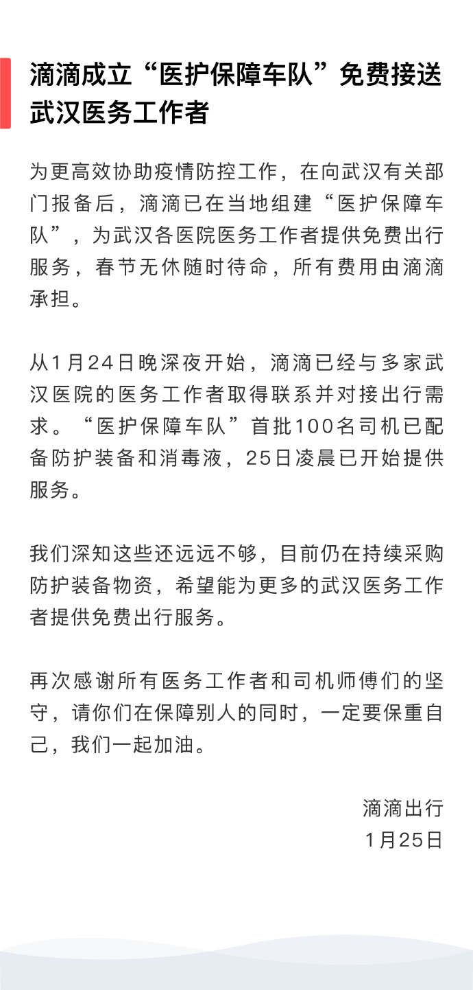速途網(wǎng)1月25日消息(報(bào)道:李楠) 今日,滴滴發(fā)布公告稱,為更高效協(xié)助疫情防控工作,在向武漢有關(guān)部門報(bào)備后,滴滴已在當(dāng)?shù)亟M建“醫(yī)護(hù)保障車隊(duì)”,為武漢各醫(yī)院醫(yī)務(wù)工作者提供免費(fèi)出行服務(wù),春節(jié)無休隨時(shí)待命,所有費(fèi)用由滴滴承擔(dān)。