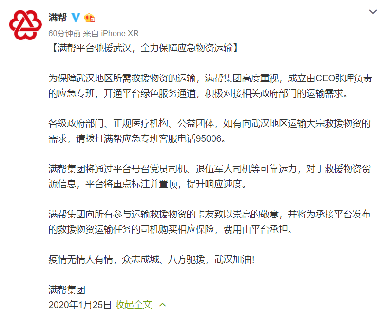 速途網(wǎng)訊 今日,@滿幫 集團表示,為保障武漢地區(qū)所需救援物資的運輸,滿幫集團高度重視,成立由CEO張暉負責的應急專班,開通平臺綠色服務通道,積極對接相關政府部門的運輸需求。各級政府部門、正規(guī)醫(yī)療機構、公益團體,如有向武漢地區(qū)運輸大宗救援物資的需求,請撥打滿幫應急專班客服電話95006。同時,滿幫集團將通過平臺號召黨員司機、退伍軍人司機等可靠運力,對于救援物資貨源信息,平臺將重點標注并置頂,提升響應速度。此外,滿幫集團向所有參與運輸救援物資的卡友致以崇高的敬意,并將為承接平臺發(fā)布的救援物資運輸任務的司機購買相應保險,費用由平臺承擔。