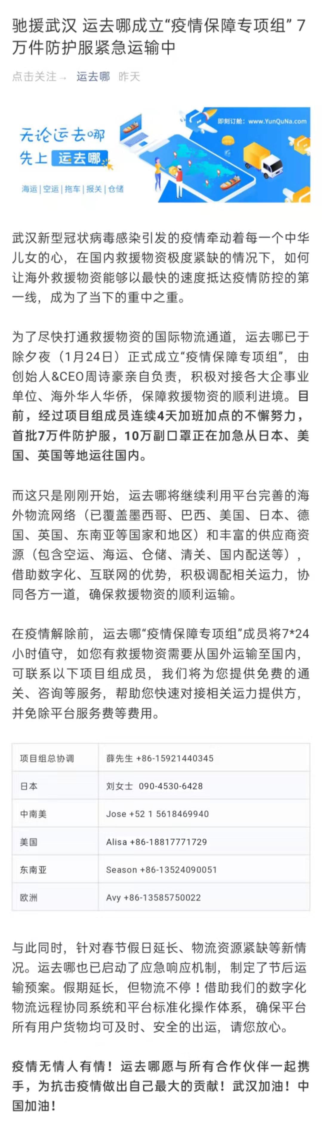 速途網訊 昨日,“運去哪” 表示,已于除夕夜(1月24日)正式成立“疫情保障專項組”,由創始人&CEO周詩豪親自負責,積極對接各大企事業單位、海外華人華僑,保障救援物資的順利進境。目前,經過項目組成員連續4天加班加點的不懈努力,首批7萬件防護服,10萬副口罩正在加急從日本、美國、英國等地運往國內。