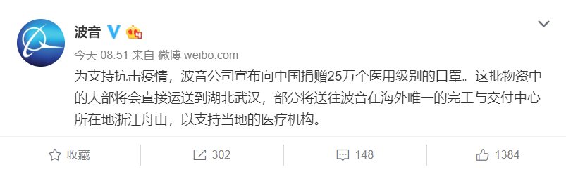 波音:向中國捐贈25萬個醫用級別口罩 仙雯 ? 2020年1月30日 15:04 ? 出行, 快訊 速途網訊 今日,波音公司宣布向中國捐贈25萬個醫用級別的口罩。波音方面稱,這批物資中的大部分將會直接運送到湖北武漢當地醫療機構,部分還將送往波音公司海外唯一的完工與交付中心所在地浙江舟山,用以支持當地的醫療機構。 贊 (0) 仙雯 0 生成海報 三星電子第四季度凈利潤44億美元,同比下滑38.2% 上一篇 2020年1月30日 15:02 家里一日游、數瓜子、做美食,來快手看老鐵們的“閉關”神狀態 下一篇 2020年1月30日 15:18